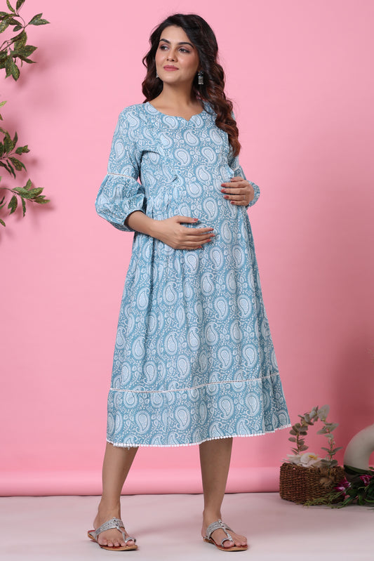 Whispering Leaves Blue Maternity & Nursing Tier Dress