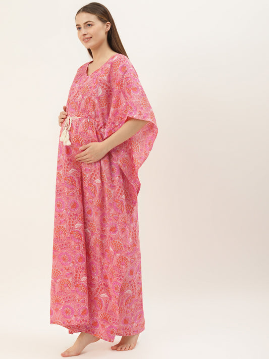 Patterned Bandhej On Pink Maternity & Nursing Kaftan
