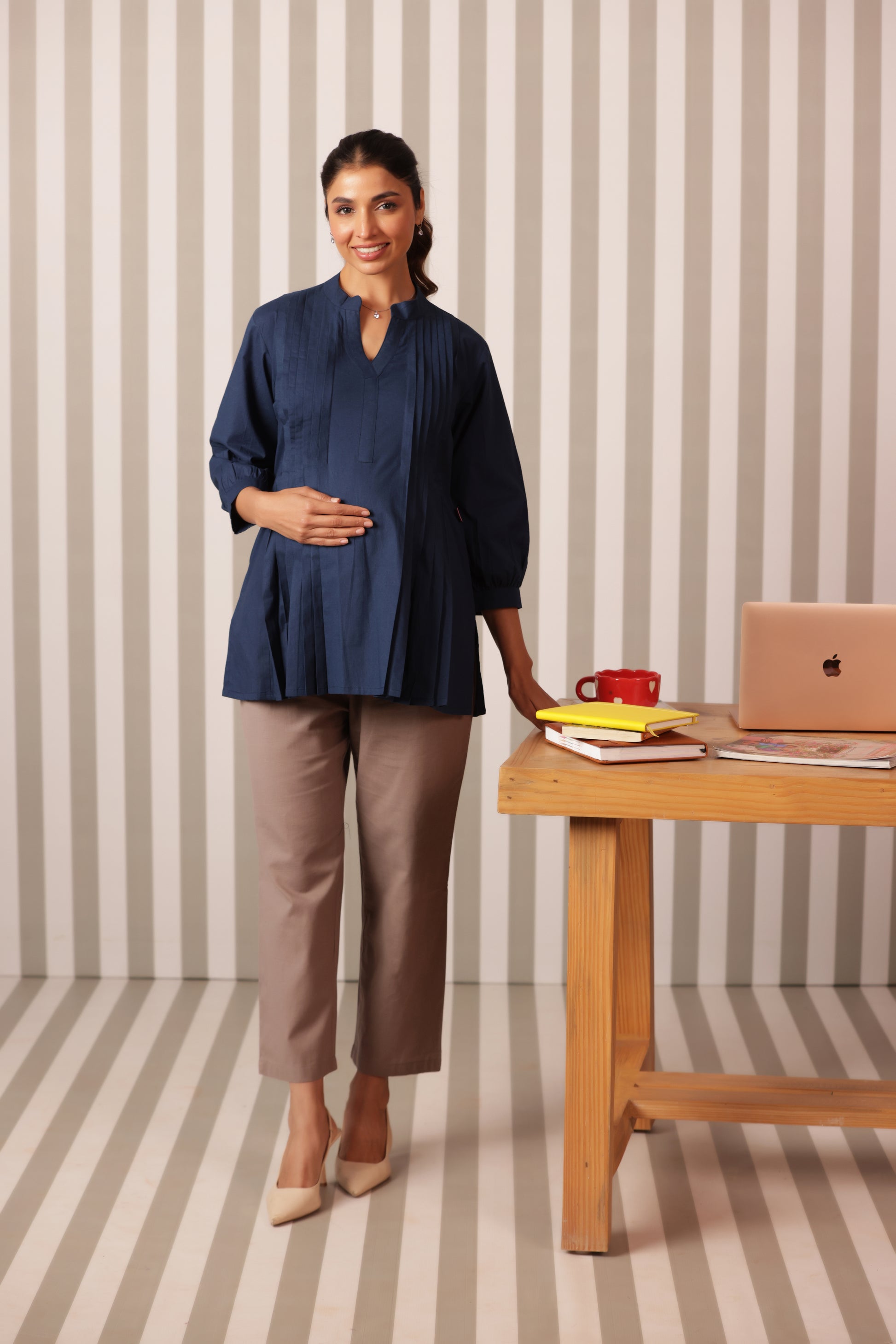 Delicate pintuck detailing on the front panel enhances the silhouette while providing extra ease around the tummy. Thoughtfully designed concealed nursing zippers allow quick and discreet breastfeeding access, making this top perfect for work, casual outings, or everyday wear. The timeless navy blue shade ensures easy styling with trousers, leggings, or palazzos.