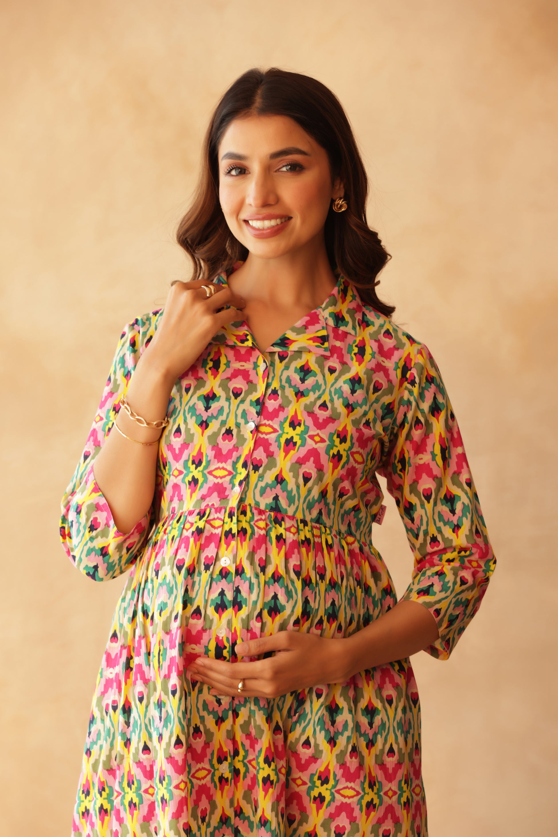 The front button-down opening makes breastfeeding easy and discreet, allowing quick access without compromising on elegance. Finished with a smart collar neckline and 3/4th sleeves, this dress blends contemporary design with everyday practicality—perfect for work-from-home days, casual outings, or relaxed festive wear.