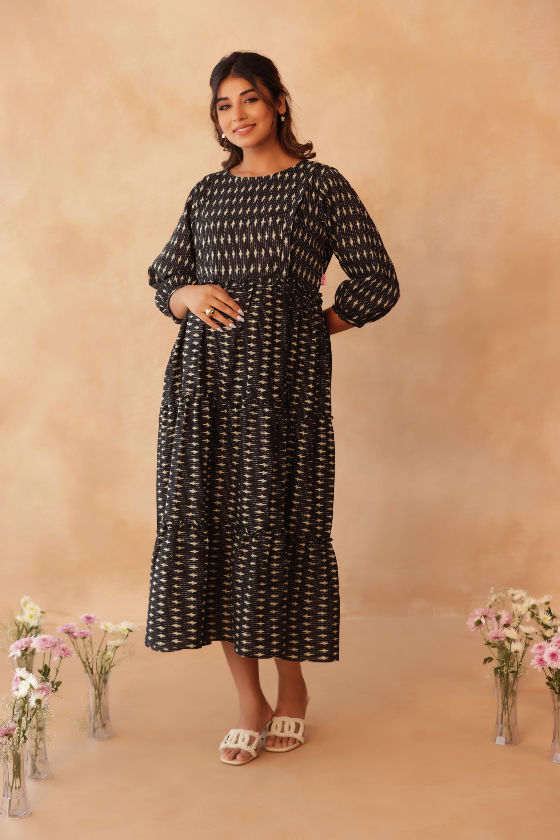 Designed for comfort, style, and functionality, this Noir Ikkat Trail Maternity & Nursing Dress is a wardrobe essential for modern moms. Crafted from soft, breathable fabric, the dress features a relaxed, tiered silhouette that comfortably accommodates your growing bump and continues to flatter post-pregnancy.